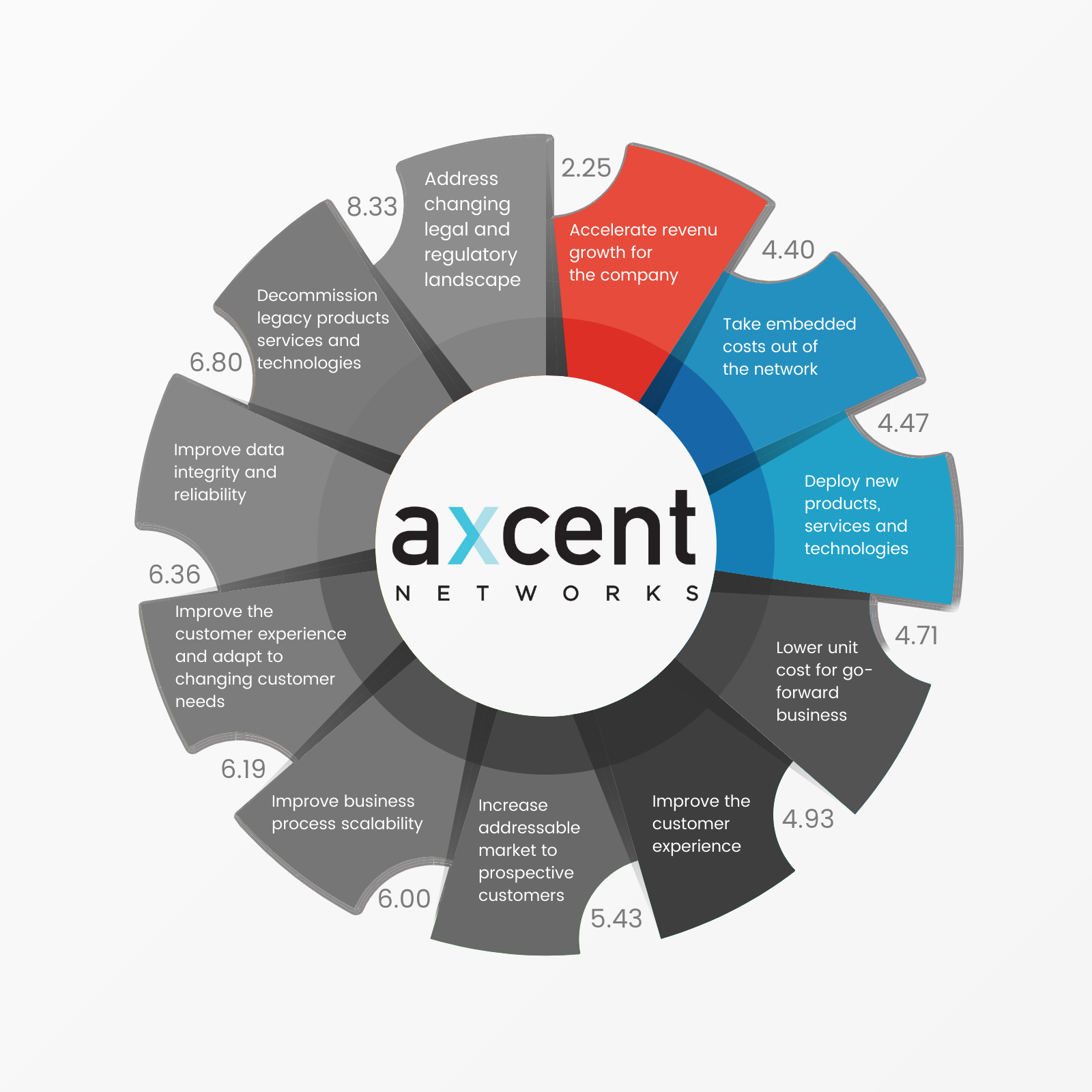 2021 marks the Telecom Act’s 25th anniversary and 40 years since the founding of INCOMPAS. To celebrate the enduring legacy of competition underpinning these milestones, our Executive Breakfast Program is dedicated to the top challenges facing today’s telecom network executives. Based on our September survey conducted along with Axcent Networks, the top challenge is, Accelerating Revenue Growth for the Company. The panel will bring together industry leaders to explore this challenge, break down the underlying dynamics, and share best practices, anecdotes, and case studies highlighting the different ways that various functions of our member companies are dealing with these challenges. We’ll also save time for an open forum and Q&A at the end. Our survey respondents ranked their top challenges from 1 -10 and what follows are the preliminary results.